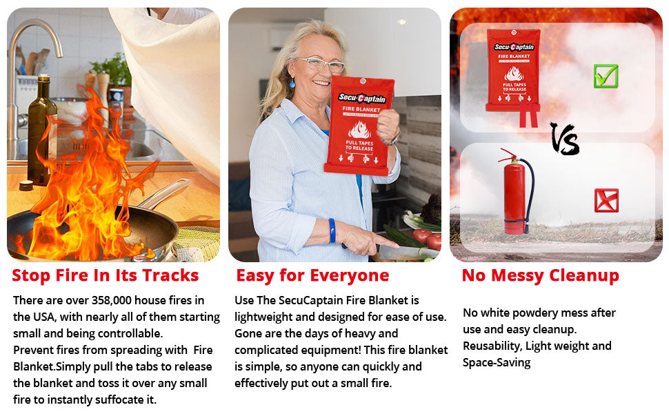 - LIGHTWEIGHT AND LEAVE NO MESS: Unlike common fire extinguishers, this fire retardant blankets is easy to carry and store, Quickly and easily extinguish small fires without creating any mess in kitchen or home. NEVER EXPIRE and there's no need for replacement.Easy to use for all ages, simply pull down the tab to deploy the blanket